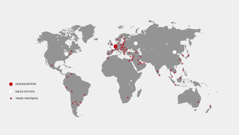 With the headquarters in Idar-Oberstein and four sales offices: in the USA, in Russia, Singapore and China, with two employees in France and approximately 72 trade partners worldwide in all important economic regions of the world, we are present worldwide. However, we still strive to extend our sales and service network with additional sales offices and partners for application oriented consultation and technical service directly locally, personally and uncomplicated.