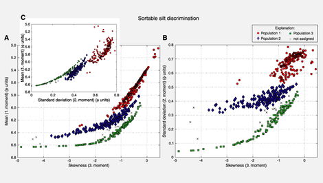 When now applying the so obtained skewness of all measured distributions for one, against the mean value of the particle size and secondly against the standard deviation of the distribution, so it is clearly recognizable in this illustration that there are three populations which can be matched to different depositing processes of the sediments, (Fig. 4).
