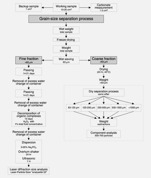 The development of below sea level deposits offshore the west coast of the Antarctic Peninsula was strongly influenced by the variation of the continental ice shield and the amount of ice in the ocean, which in turn influences the global climate. With core-depth drillings, these variations can be backtracked over periods of several millions of years. A significant aid is the particle size analysis. A substantial parameter which is determined during the examination of the sediments is the particle distribution of the obtained material. Here, at first, in an extensive procedure, the share of a particle size smaller than 63 μm is attained and prepared for the particle size determination.