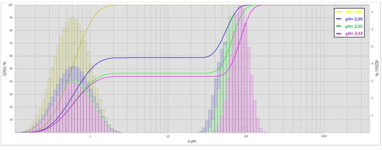 A phenomenon familiar from everyday life is sour milk. The lactic acid bacteria gradually decompose the lactose and the casein contained in the milk coagulates. A flocculation becomes visible. This process of milk protein coagulation can be brought about artificially by lowering the pH value of the milk, for example by adding citric acid. Figure 1 shows a clear dependence of the particle size distribution on the pH value of the emulsion. Both the cumulative curve Q3(x) in line representation and the distribution of the particle size classes dQ3(x) as a column diagram as a function of the particle diameter x are shown. Assuming a pH value of pH=7.07 and a monomodal particle size distribution with a d50 value of 0.583 µm (d50: 50 % of the total sample volume has a particle diameter smaller than or equal to this value) an increased flocculation is observed due to a continuous reduction of the pH value down to pH=2.53, which is reflected in the bimodal distribution of the particle size and the corresponding d50 value of 60.435 µm. It is essential to detect the pH value as accurately as possible, since even changes in the hundredth range result in a significant change in the particle size distribution. The final evaluation of the measurement results thus allows the conclusion that even with trivial analyses, such as milk in tap water, one can be quite critical of the quality of the measurement medium. The additional pH value monitoring logically benefits many other protein-based samples, for example from the food and pharmaceutical sectors.