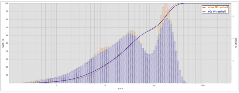 In addition to monitoring the pH value in the case of pH-critical samples or maintaining the same ambient conditions at all times for the purpose of quality assurance, the pH value can also be used to draw conclusions about the degree of non-dispersed, i.e. still agglomerated, particles. Figure 2 shows the particle size distribution of quick cement on the one hand directly after addition to the dispersion bath and on the other hand after 60 s ultrasonic treatment at a power of 50 W, which is used to de-agglomerate the particles. In the course of ultrasonic treatment, the d50 value is reduced from 36.029 µm to 35.237 µm.