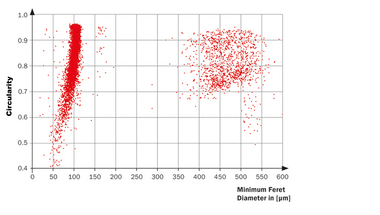 Each particle can be clicked individually: For fast single image viewing, each individual particle can be opened directly with a mouse click from the clearly arranged The really important information for you about the morphology will be shown by the position of the data point in the Cloud. Without time-consuming search, you can immediately analyse, evaluate and delete individual selected particles. All available size and shape parameters are automatically displayed.