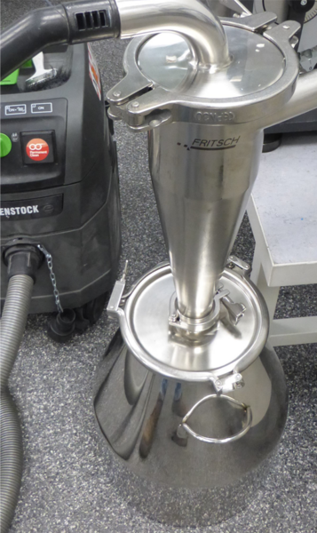 For the tests in our application laboratory, the down was dried in a drying cabinet. Down whose moisture content is too high causes difficulties during grinding, as the sieves used can easily become clogged during the grinding process. The low density of the down, together with a possible swirling of the sample during the grinding process, makes the use of our high-performance cyclone with sample extraction advisable.