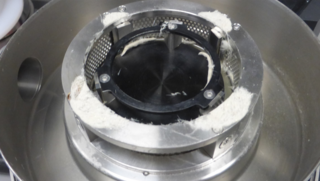 Due to the large volume of the comminuted sample, the 1 litre jar was replaced by the 20 litre collection jar after a grinding time of 30 seconds. Fig. 4 documents that there was only a small amount of the sample left in the grinding chamber, which were removed by brush and vacuum. A total of 20 grams of comminuted sample was packed.