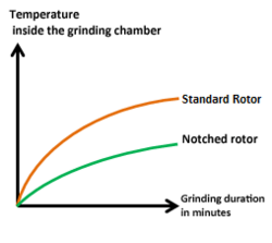 The new rotor with notched edges never completely closes the grinding chamber completely thus allowing optimal air flow. This significantly increases the throughput and makes the use of very fine sieves for larger quantities possible in the first place. This effect is particularly decisive especially for samples with residual moisture (food stuffs, feed or plants) and samples with a low melting point (plastics).