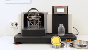 In the second test, a part of the pre-comminuted sample from the PULVERISETTE 19 LARGE, was further processed in the PULVERISETTE 14 premium line. Two hundred milliliters of the sample were comminuted within 38 seconds to a final fineness < 500 µm. The PULVERISETTE 14 premium line was equipped with the cutting rotor, as well as additionally connected to the small volume Cyclone separator, which was operated passively.
