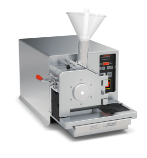 With the help of an industrial vacuum cleaner and the high-performance Cyclone separator, a negative pressure is generated in the grinding chamber. The material is fed into the FRITSCH PULVERISETTE 19 via a funnel. Different sieve cassettes define the final fineness of the cannabis sample. Unmilled cannabis plant material has a bulk density of 100-125 g/litre, while ground material has a bulk density of 225-250 g/litre.