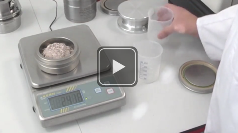 Comminution of a rock sample smaller than 5 mm with an adapter for small grinding bowls and as a counter weight an empty grinding bowl 500 ml.